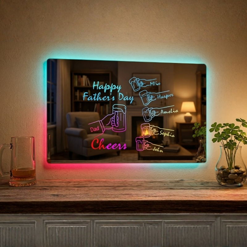 Personalised Cheers Dad Mirror Light Custom Child Names Happy Father's Day Whiskey Beer Theme Lamp for Daddy