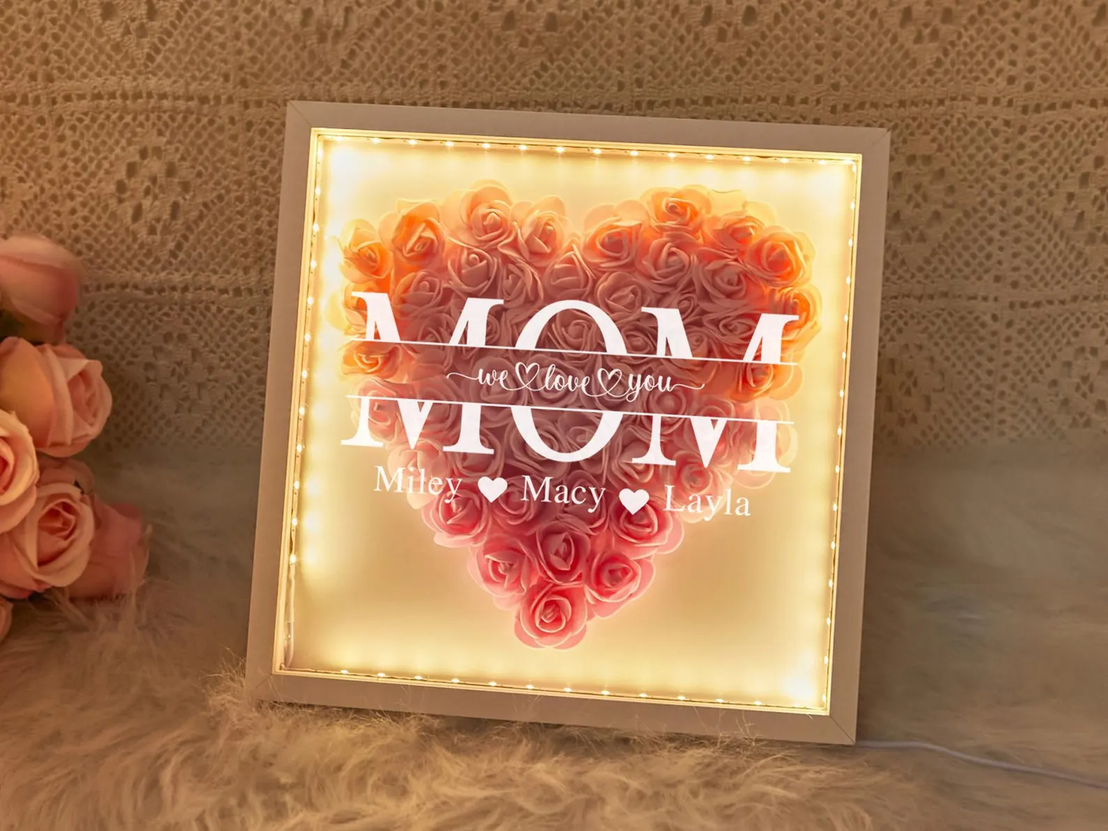Personalised Mom Flower Shadow Box with Kids Name Rose Frame LED Light Mother's Day Gift