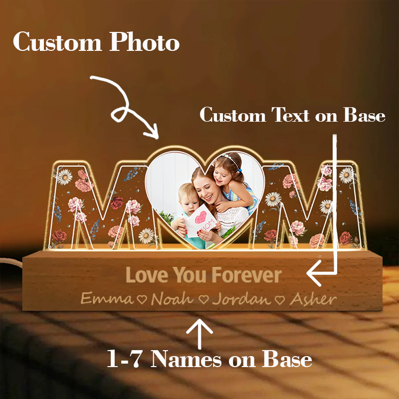 Personalised Mum Heart Photo Night Light Custom Text and Name LED Night Light Mother's Day Gift